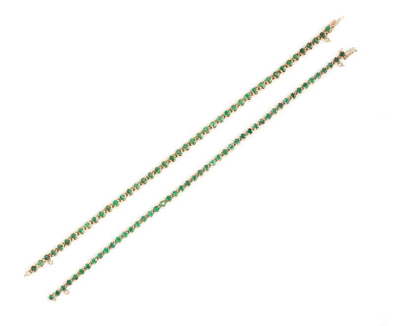 consisting of one bracelet containing 44 round mixed cut emeralds weighing approximately 3.52 carats total, together with one bracelet containing 48 round mixed cut emeralds weighing approximately 3.36 carats total. Stamp: 14K.