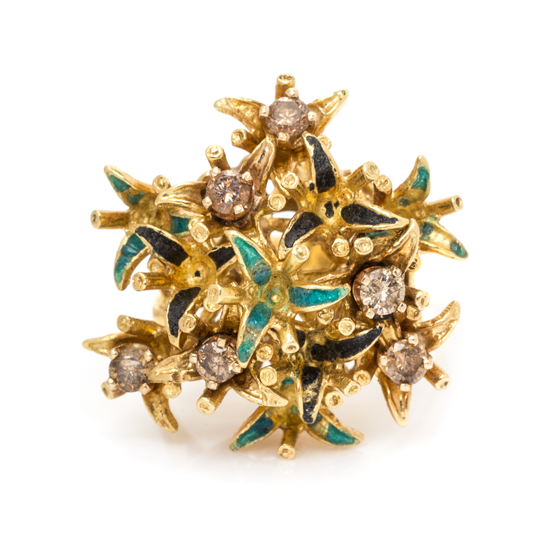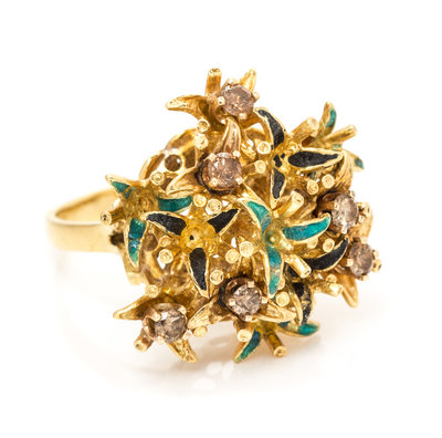 in a flower cluster motif with light and dark green enamel accents, the ring containing six round brilliant cut brown diamonds (origin of color not tested) weighing approximately 0.47 carat total.Stamp: (assay marks) ZZ 18K.