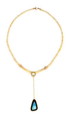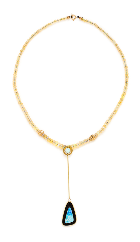 consisting of a central pendant containing a free form buff top carved onyx and opal doublet, one round brilliant cut diamond weighing approximately 0.11 carat and one round cabochon cut opal measuring approximately 5.80 mm in diameter, suspended from a polished opal bead necklace.