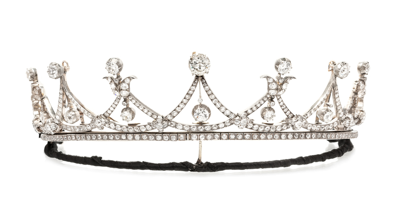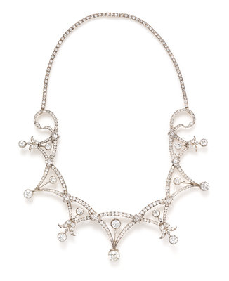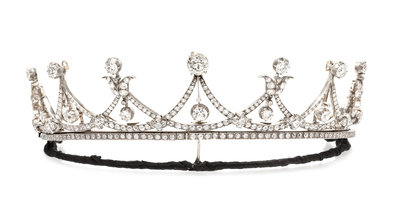 consisting of a openwork link section which serves as both the tiara and necklace centerpiece, the section composed of graduated peaks punctuated with scrollwork and collet settings, extending to a back chain of later addition, the components containing numerous old mine cut diamonds weighing approximately 16.50 carats total, together with the yellow gold tiara frame.Accompanied by a leather bound case signed Edward Tessier.Jeweler Profile:The Tessier family, a multi-generational member of London's jewellery elite, were well known for their exquisite work during the 19th and early 20th century. They excelled at the complex design and crafting of convertible jewelry such as the present lot, providing options for every important occasion. Perhaps most notably, they were commissioned to produce a magnificent graduated diamond necklace for Queen Mary.