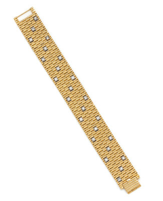 in a corrugated link design accented at regular intervals with box settings containing 24 round brilliant cut diamonds weighing approximately 1.32 carats total. Stamp: 14K C+B.