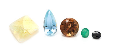 consisting of a pear shaped mixed cut aquamarine weighing approximately 7.84 carats and measuring approximately 19.52 x 9.96 x 7.30 mm, a round mixed cut golden topaz stone weighing approximately 13.98 carats and measuring approximately 14.20 x 14.20 x 10.23 mm, and an oval mixed cut emerald weighing approximately 1.36 carats and two pieces of opal, measuring approximately 7.22 x 5.70 x 3.91 mm.