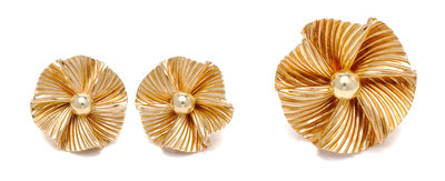 consisting of a brooch and matching earrings in a fluted spiral motif.Stamp: (maker's mark) 14KT.