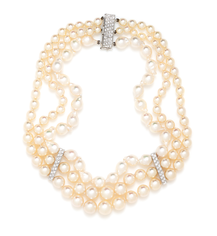consisting of two strands of graduated pearls measuring approximately 4.77-9.77 mm in diameter and one strand of baroque pearls measuring approximately 7.90-8.25 mm in diameter strung knotted with two white gold spacer bars and a white gold clasp containing numerous round brilliant cut diamonds weighing approximately 0.36rat total.Stamp: 750 KS.