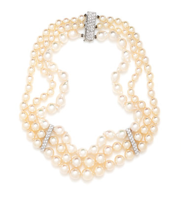 A White Gold, Diamond and Cultured Pearl Triple Strand Necklace,