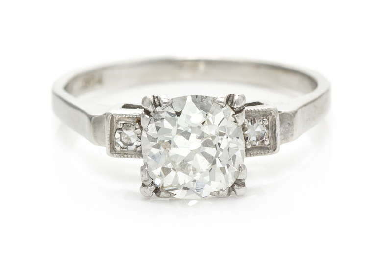 containing an old mine cushion cut diamond weighing approximately 1.37 carats and two round single cut diamonds weighing approximately 0.02 carat total. Stamp: PLAT.
