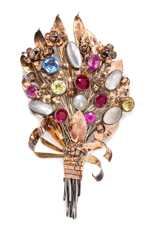A Sterling Silver, Gilt Silver, Paste and Moonstone Floral Bouquet Brooch, Hobe,