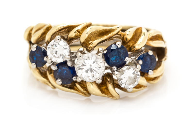 consisting of a 14 karat white gold ring containing three round brilliant cut diamonds weighing approximately 0.70 carat total and four round sapphires measuring approximately weighing approximately 1.00 carat total together with a textured yellow gold ring guard. Stamp: 14K.