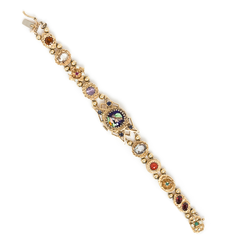 the dial cover containing a round polychrome enamel portrait of a female in period dress, the lugs containing four round mixed cut sapphires measuring approximately 2.82 mm in diameter, dial signed ELOGA, applied gilt baton and Arabic numerals, gilt baton hands, manual wind 17 jewel movement signed ELOGA, bracelet and clasp consisting of nine slide charms with various shapes and motifs containing turquoise, seed pearl, emerald, coral, abalone cameo, amethyst, ruby and citrine.Stamp: 14K.