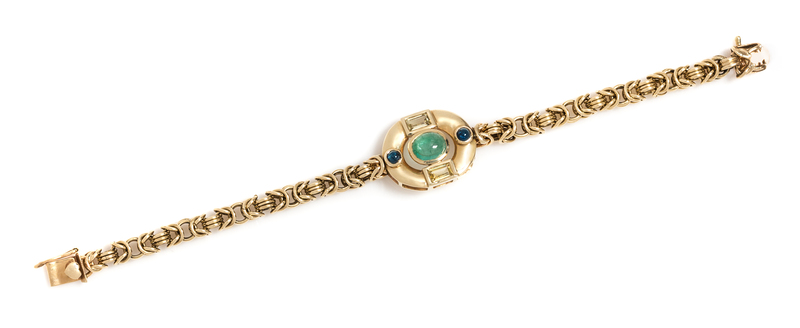 consisting of a Byzantine chain bracelet with a central oval plaque containing one oval cabochon cut emerald measuring approximately 8.30 x 7.21 mm, two round cabochon cut sapphires measuring approximately 3.32-3.55 mm in diameter, and two rectangular step cut citrine measuring approximately 6.04 x 4.09 mm.Stamp: 14K.