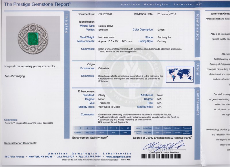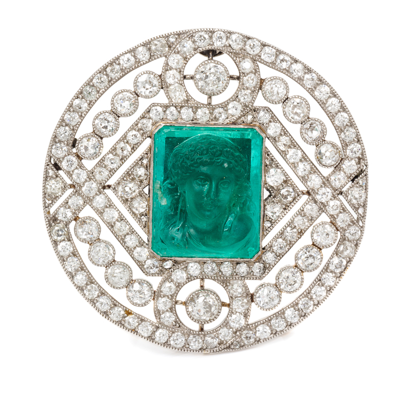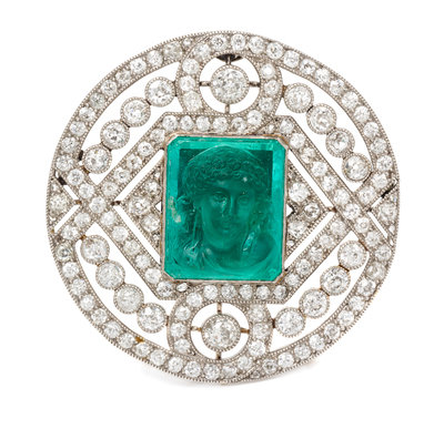 in an intricate openwork circular setting containing a bezel set high relief emerald cameo depicting a Classical female profile raised above the step cut octagonal ground and measuring approximately 15.77 x 13.11 mm, together with 130 old European cut diamonds weighing approximately 4.36 carats total.Accompanied by an American Gemological Laboratories emerald identification and origin certificate number CS 1072861, dated January 20, 2015, stating Mineral Type: Natural Beryl, Variety: Emerald, Origin: Colombia, Enhancement: Minor, Type: Traditional.