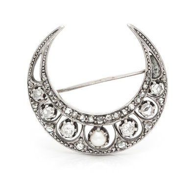 A Victorian Silver Topped Gold, Diamond and Pearl Crescent Brooch,