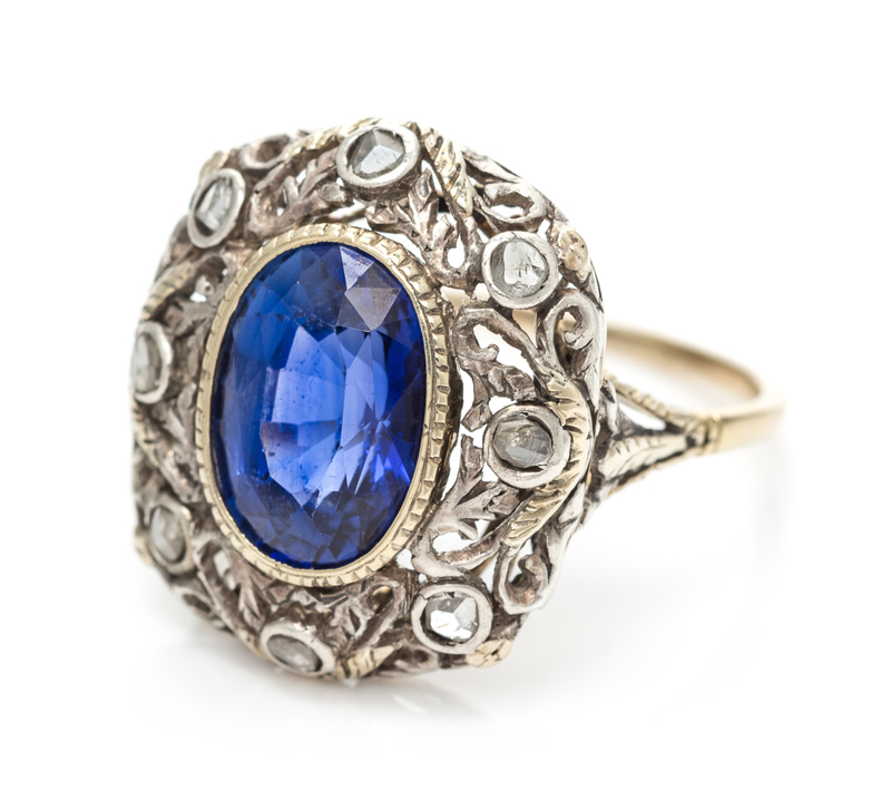 in an openwork foliate and scrollwork motif, containing one oval mixed cut synthetic sapphire within an intricate millegrain bezel and eight rose cut diamonds, the trifurcated shank with hand engraved detail.
