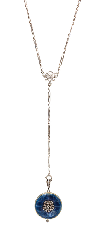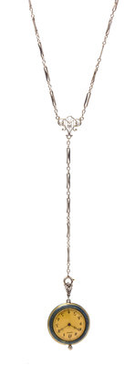 consisting of a 27.00 mm case diameter, matte gilt dial signed LONGINES, Arabic numerals, blued steel moon hands, light blue enamel bezel, the reverse surmounted with an openwork plaque containing one old mine and four rose cut diamonds over translucent light blue enamel on an intricate guilloche ground, stem wound and set 17 jewel mechanical movement with five adjustments signed PHELPS & PERRY, NEW YORK LONGINES W. CO., suspended by the openwork hinged bail set with rose cut diamonds from a white gold fancy oval link lavaliere chain containing three old European cut diamonds weighing approximately 0.06 carat total. Case back stamp: WITTANUER SWISS 18K 1825942.Movement number: 2273018.