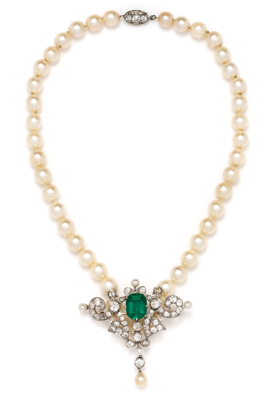 consisting of a central openwork brooch with scrollwork accents containing a central simulated emerald, three old European cut diamonds weighing approximately 0.91 carat total, 42 old European and rose cut diamonds weighing approximately 2.49 carats total, and five pearls (origin not tested), the brooch suspended from a single strand of cultured pearls measuring approximately 8.00-8.10 mm in diameter strung knotted with a platinum openwork clasp containing three old European cut diamonds weighing approximately 0.37 carat total.