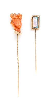featuring a coral carving of a woman's head with a twist design on the pin and a bezel set rectangular buff top opal pin.