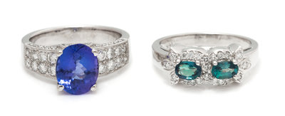 A Collection of White Gold Tanzanite, Alexandrite and Diamond Rings,