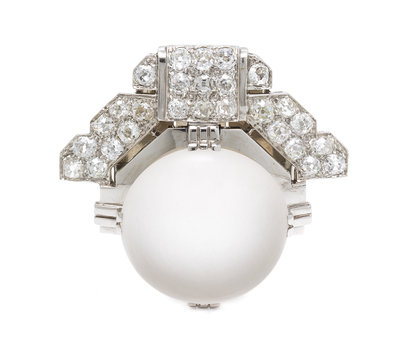 containing one round cabochon cut frosted finish rock crystal plaque measuring approximately 22.50 mm in diameter, together with 27 old mine cut diamonds weighing approximately 3.38 carats total. Stamp: (French import mark).