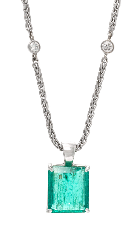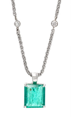 containing one octagonal step cut emerald measuring approximately 11.75 x 10.38 x 3.70 mm, suspended from an 18 karat white gold wheat chain containing four round brilliant cut diamonds weighing approximately 0.28 carat total.Pendant stamp: 14K.Chain stamp: ITALY 750.