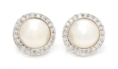 A Pair of White Gold, Cultured Mabe Pearl and Diamond Earclips,