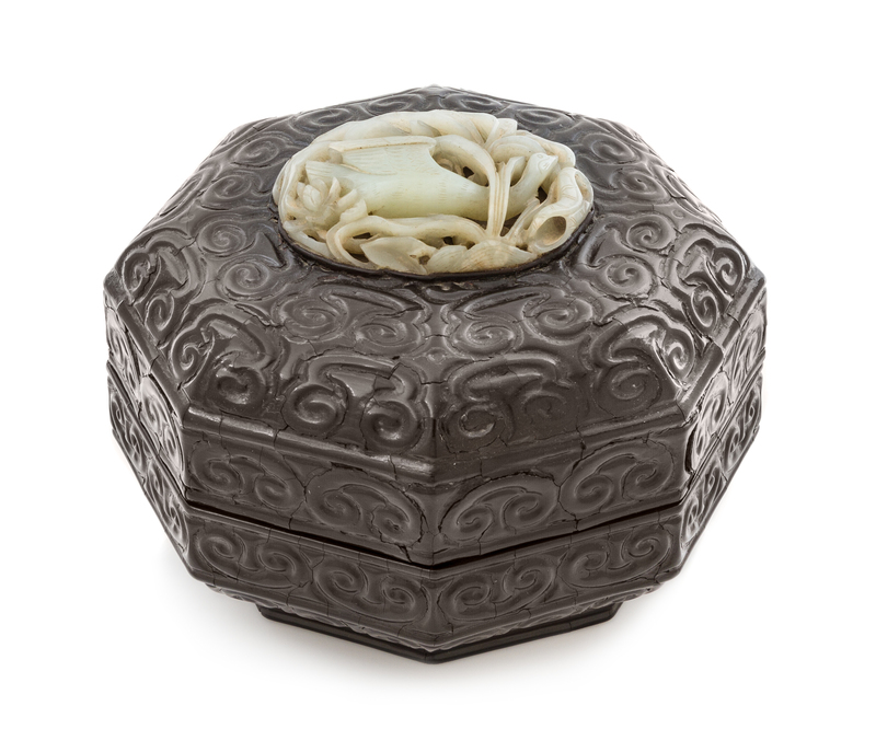A Pale Celadon Jade Inlaid Tixi Lacquer Box and Cover