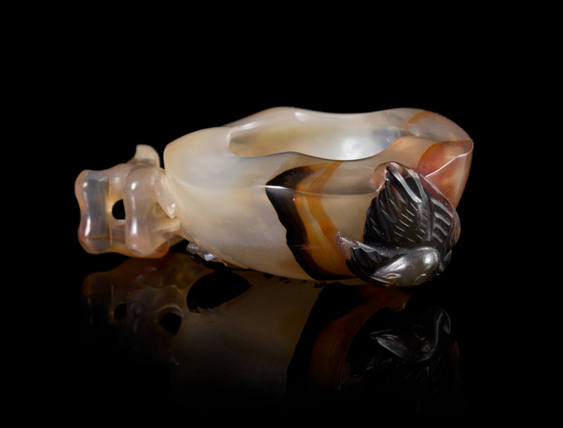 of rounded form surmounted by an inverted floriated lip, a handle of reticulated branches ending in a bloom carved on the underside, the body carved with a bird, of white color with black and russet veining.