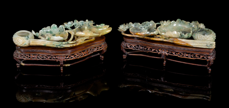 each of an apple green and celadon stone with russet skins and dark green specks, each carved to depict a large lotus leaf, one centered with a crab, the other a recumbent duck, the sides carved in high relief with blooming lotus, stems and a rounded basket, raised on a pierce carved hardwood stand.