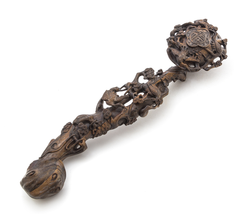 in the shape of lingzhi, the larger terminal carved in relief showing a central fu character surrounded by cranes and pine branches.
