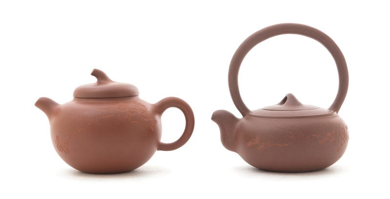 the first body of globular form incised with a bird rest on grape vines with arched side handle, the second of compressed form with similar decoration surmounted by an overhanging handle, both stamped with maker's marks.