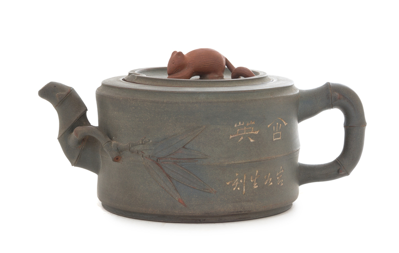 of cylindrical form, the body, handle and spout molded and painted to immitate bamboo, having applied bamboo shoot decoration and incised inscription, having an all-over dark green glaze, the cover surmounted by a brown squirrel finial.