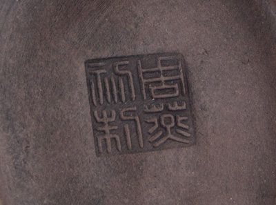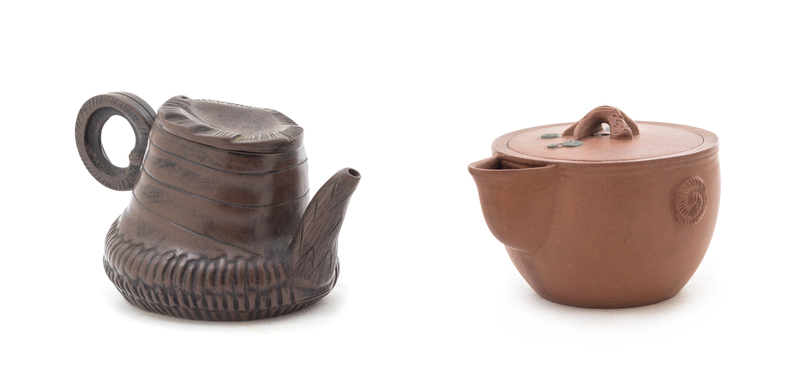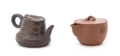 the first in the form of a tree trunk with curved spout and a loop shaped handle, the second of hemispherical form with the flat cover molded with pine decoration, both stamped with maker's mark.