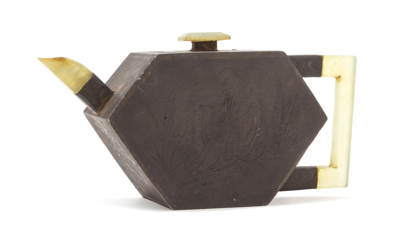 of hexagonal form, one side incised with the immortal of longevity, Shoulao bearing a staff, the other side with a pair of deer, having hardstone mounted handle, spout and finial, the underside bearing a four-character maker's mark reading Yang Pengnian zhi.