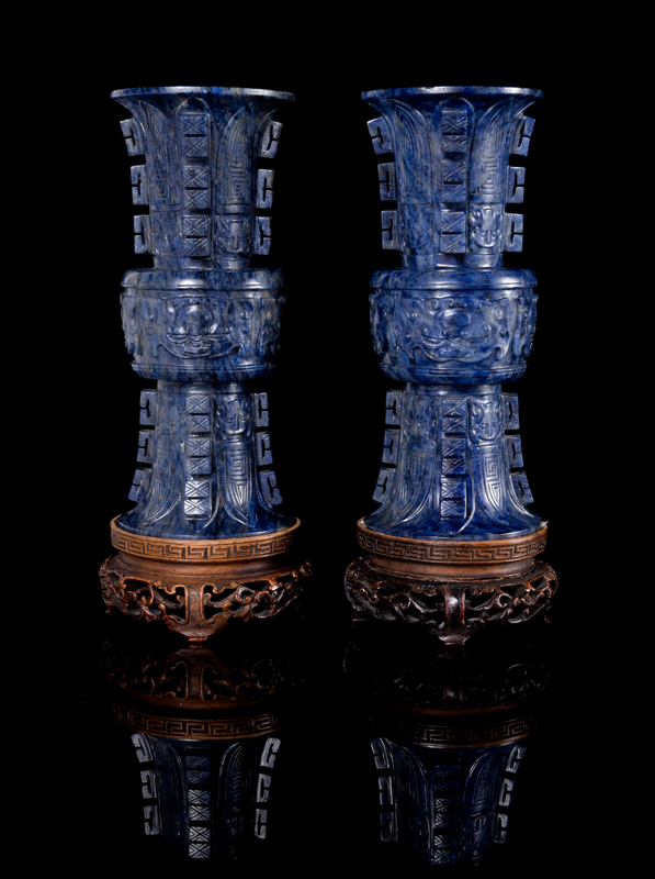 A Pair of Carved Hardstone Gu-Form Miniature Vases