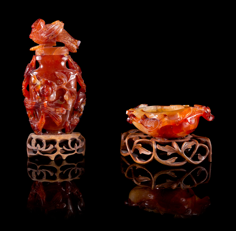 the first a covered vase carved in high relief with flowering branches, surmounted by a bird form finial; the second a small brushwasher carved to the side with flowers, each raised on fitted hardwood stands.