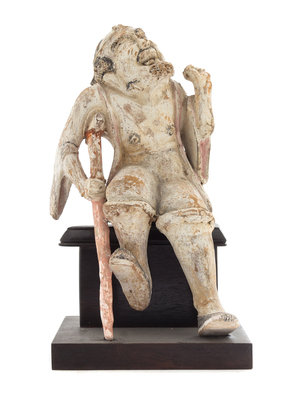 the figure depicted seated with his left hand raised and the right hand bearing a cane, set on a hardwood stand.