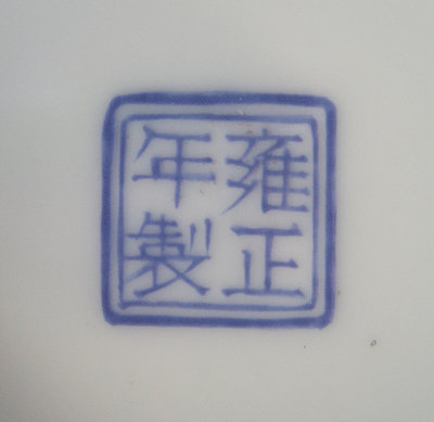 painted to show flowering prunus branches, the underside bearing a blue enameled four-character Yongzheng mark within a double square panel.