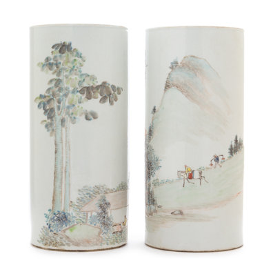 each of cylindrical form, painted throughout to depict a continous mountain scene, one with a figure astride a horse followed by his attendant; the other a male seated in a house, signed Cheng Xueli; bearing a four-character Gaungxu red stamp mark to the underside.