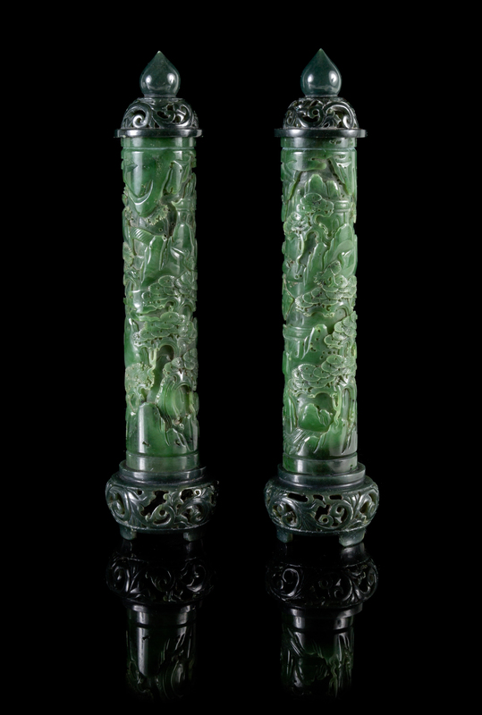 each of cylindrical form depicting a scholar and his attendant in a mountainous landscape, walking on a bridge amongst pine trees, with rockery and cranes, pavillions and boats in distance, all under clusters of clouds to the mouth, the spinach jade cover and base carved with foliate decoration.