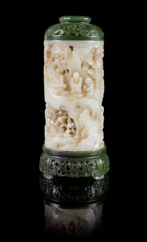 of cylindrical form, pierce carved to show a continuous moutain scene with scholars in various pursuits, amongst rockworks below a border of clouds to the mouth, the spinach jade cover carved with lotus surmounted by a finial in the shape of a lotus bud, the stand decorated with foliate scrolls.