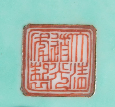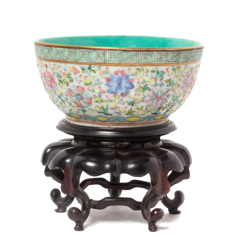 decorated with colorful meandering lotus branches, between a keyfret border to the mouth and a band of overlapping ruyi heads, bearing a Daoguang six-character iron red mark within a square panel against a turquoise ground, raised on a hardwood stand.
