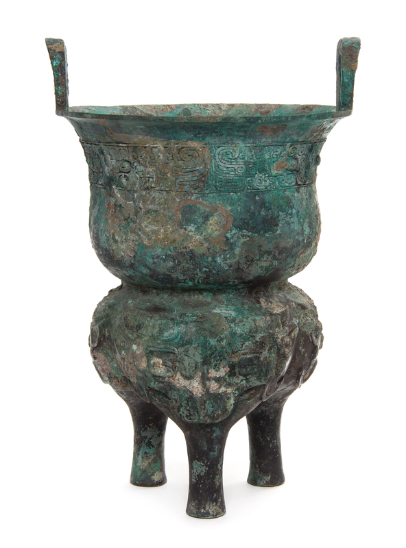 the rounded, slightly waisted bowl having upright loop handles, with a band of bird and taotie, the tripod lower section having above horned bovine masks.