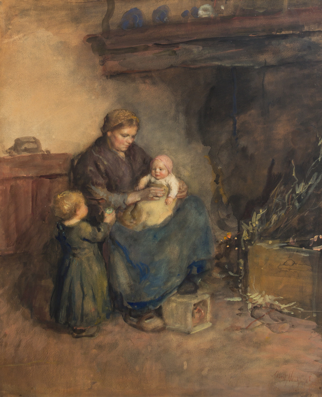 Mother with Children by Fireplace