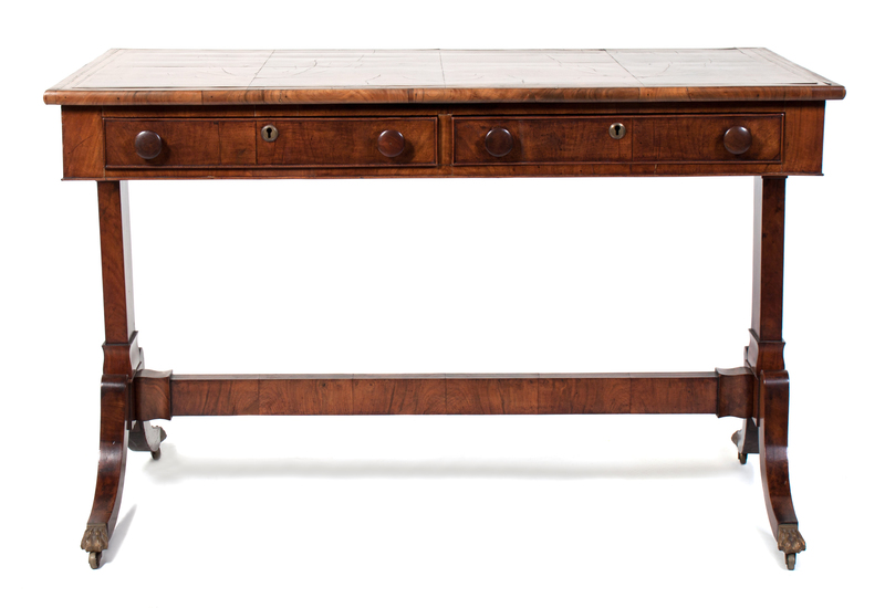having a top with figured walnut, book matched quarter panel veneer and brass string inlay over an apron frame with two cockbeaded drawers with brass escutcheons and wooden pulls and opposing faux drawer fronts and supported by a trestle base with sabre legs terminating in brass paw feet on brass castors.