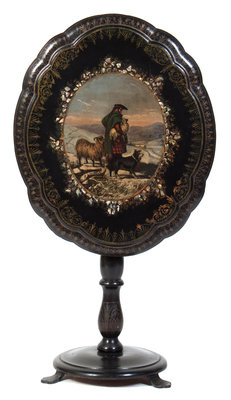 the shaped oval top having mother-of-pearl inlay, painted to depict a Scottish sheepherder, over the baluster form standard raised on a shaped base.