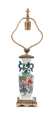 of baluster handled form, having allover polychrome decoration, mounted as a lamp.