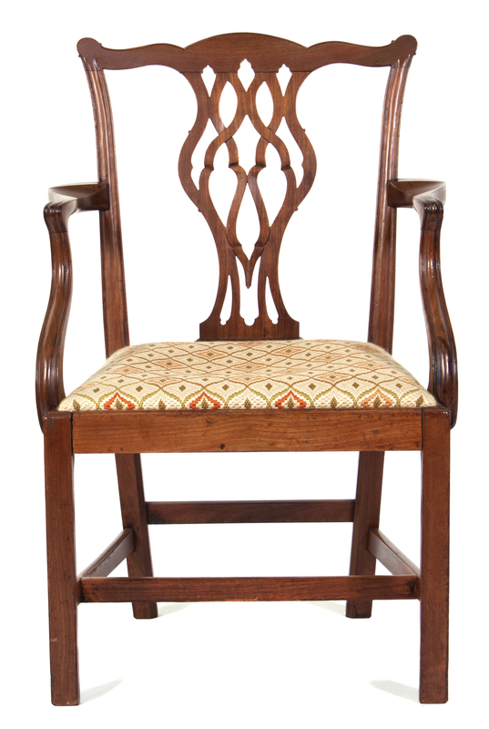 having a shaped crest with beaded ears, intricately pierced splat, molded stiles and arm supports, and straight reeded and tapered legs joined by cross stretchers
