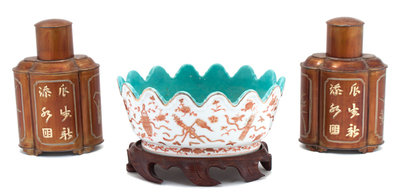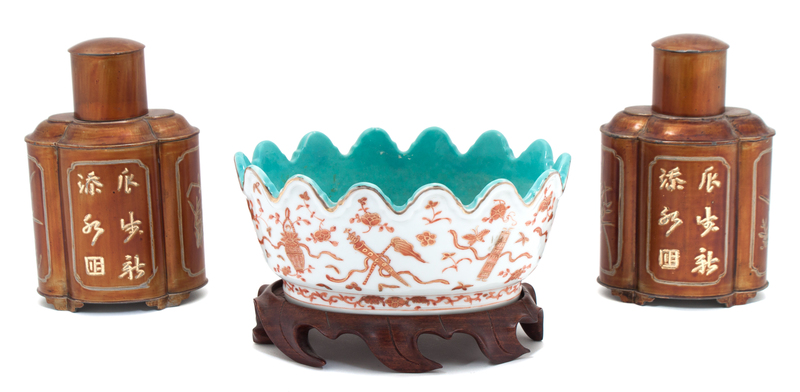 comprising a pair of tea caddies and a porcelain bowl on a stand.