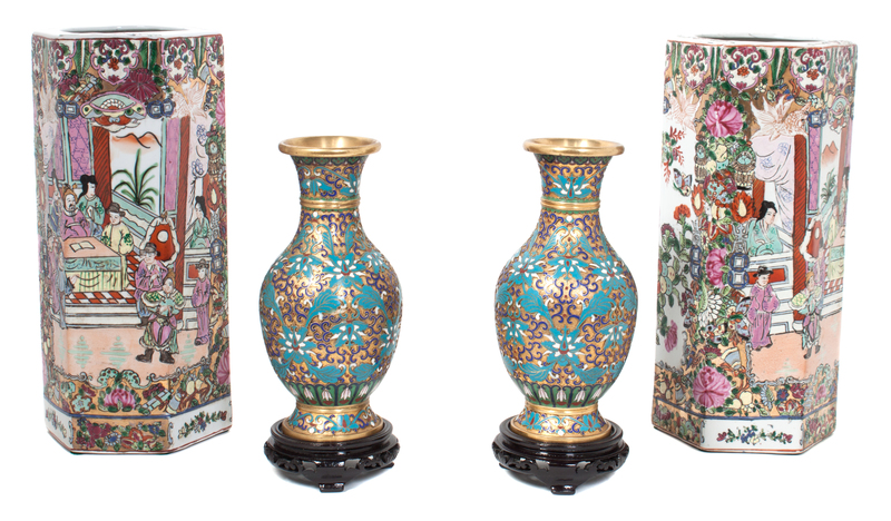 comprising a pair of cloisonne vases and a pair of porcelain hat stands.