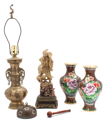 comprising a porcelain dish, a gilt metal lamp, a soapstone figure and others.