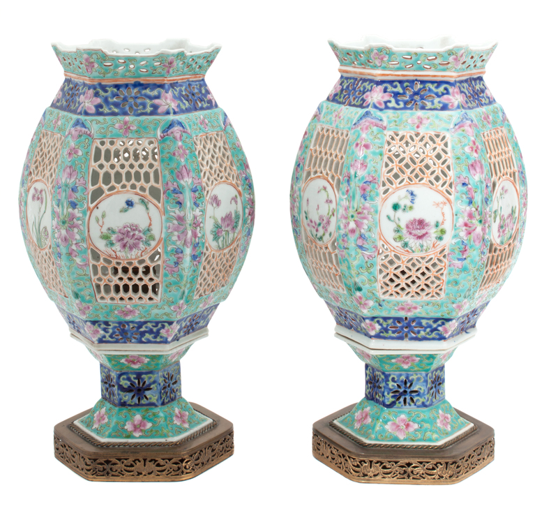 A Pair of Chinese Famille Rose Porcelain Reticulated Lanterns